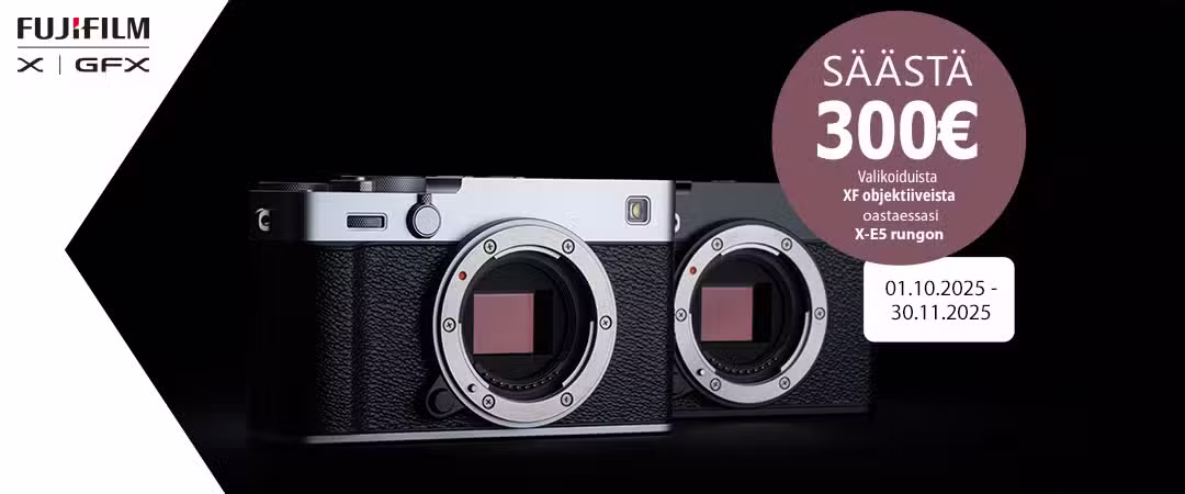 Osta Fujifilm X-E5 runko tai kitin yhdessä kampanjaan kuuluvan objektiivin kanssa niin saat 300€ alennuksen!